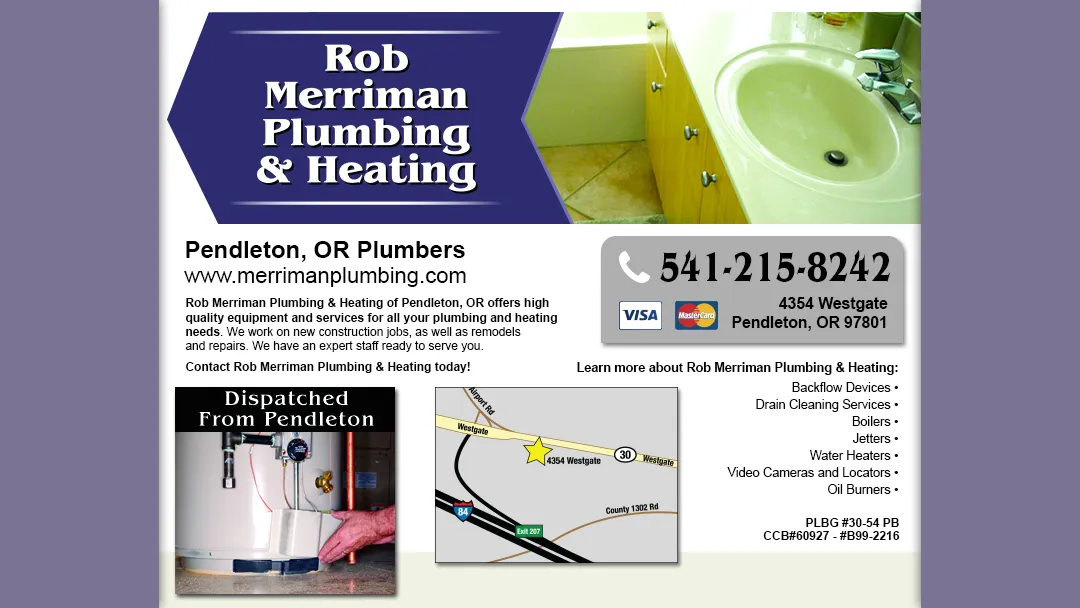 Rob Merriman Plumbing & Heating has served the Pendleton community for over 20 years, offering trusted plumbing and heating services. Located at 4354 Westgate, Pendleton, OR 97801, United States, we are committed to 24/7 support for all your HVAC needs.
